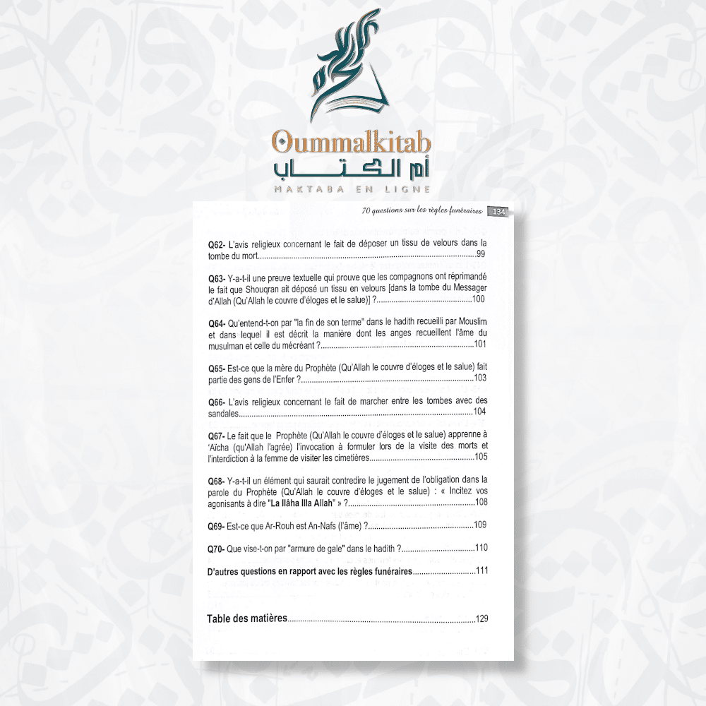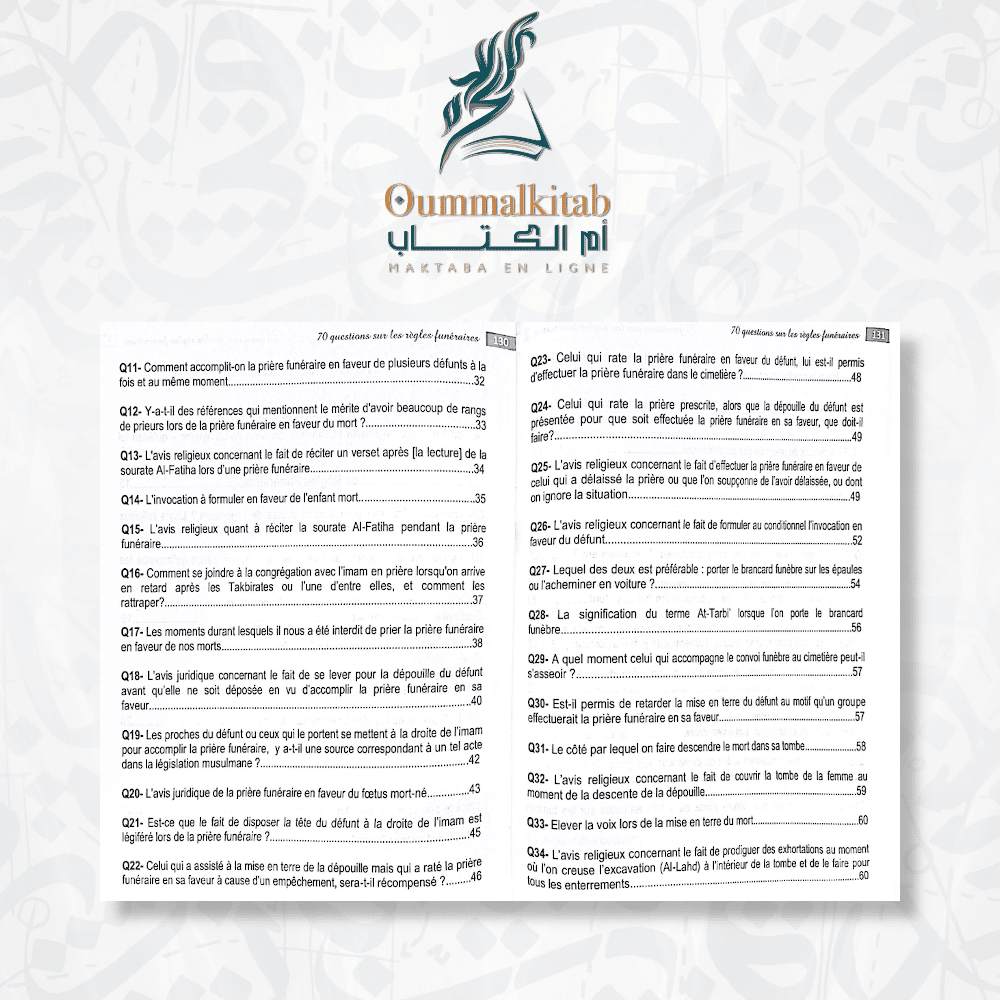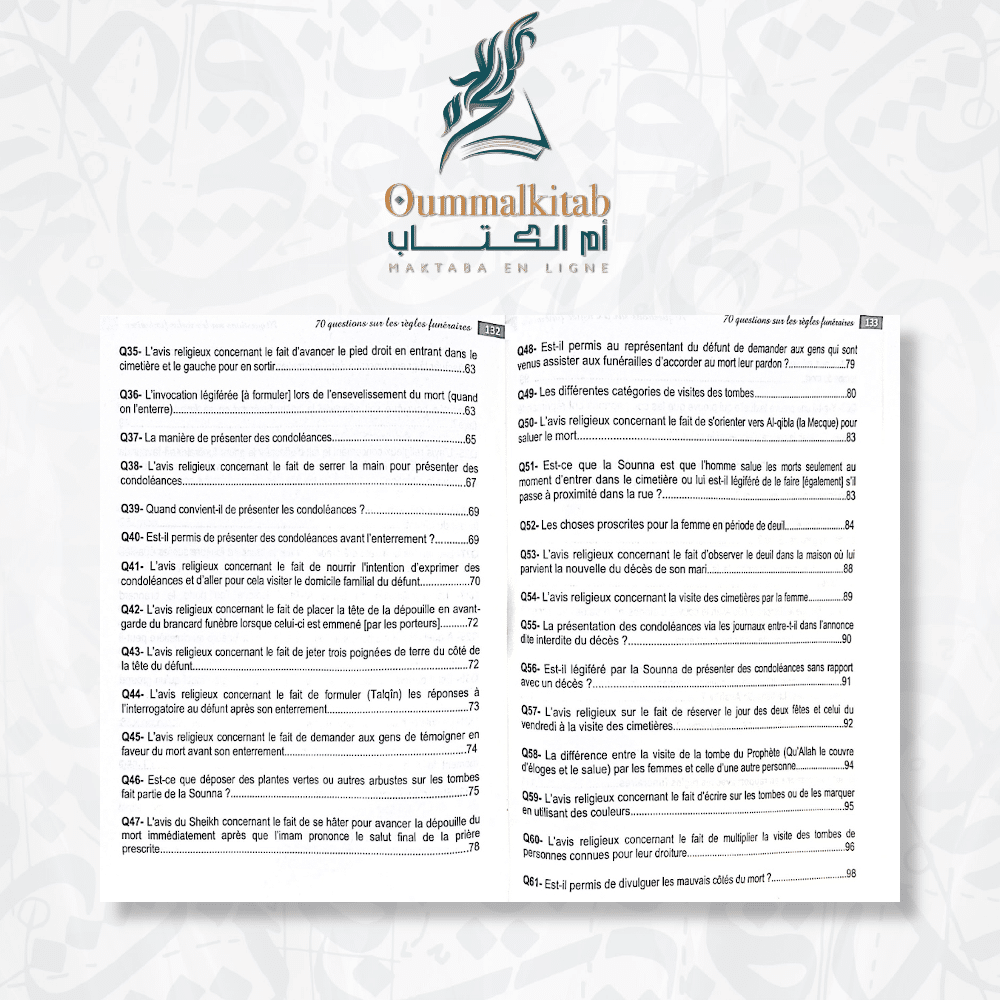 Dans « 70 Questions sur les Règles Funéraires », l’auteur explore en profondeur les aspects cruciaux des rituels funéraires dans l’Islam. Ce guide exhaustif couvre toutes les étapes du processus funéraire, fournissant des réponses claires et détaillées à des questions essentielles pour les musulmans. Voici un aperçu des sections clés de ce livre informatif :