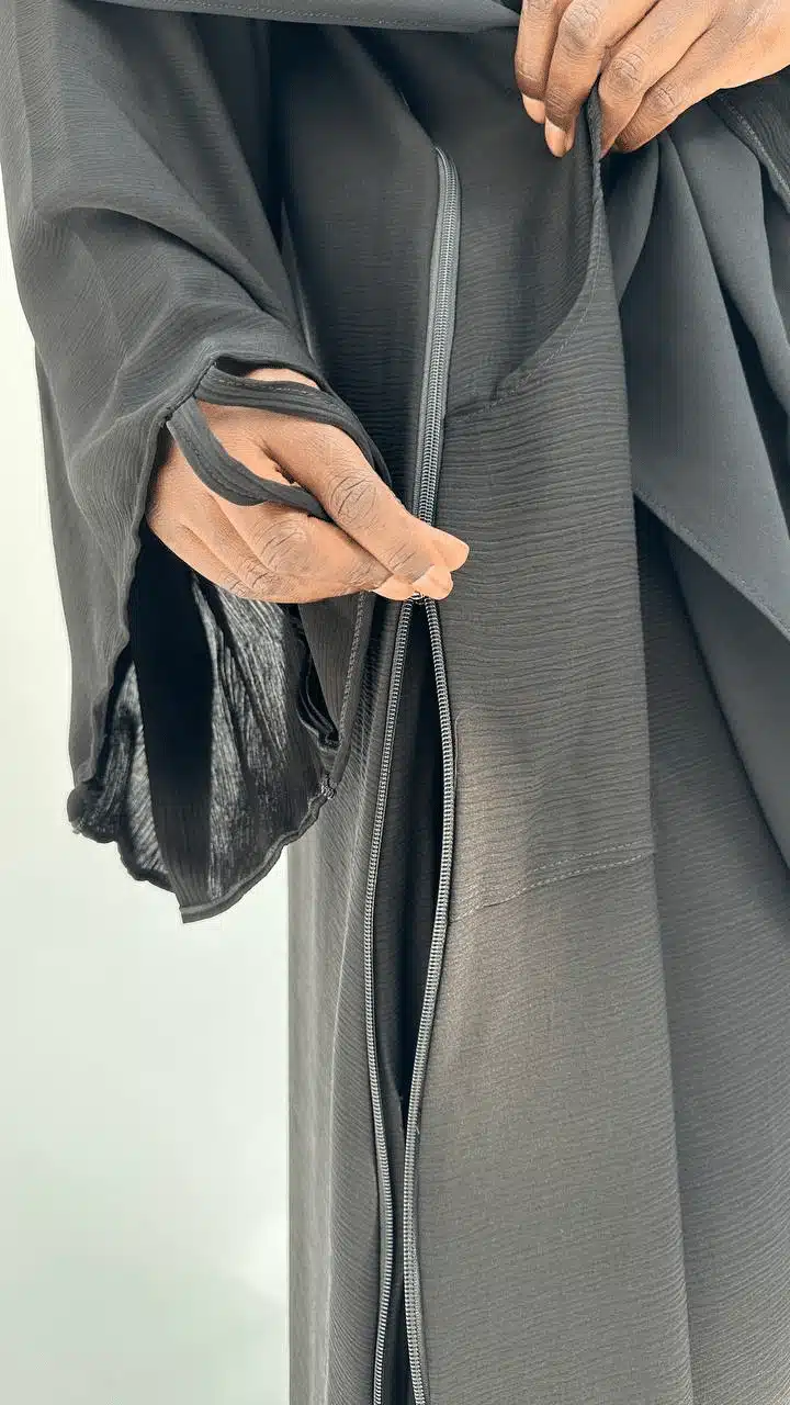 Avec son zip discret au niveau du cou, l’Abaya AJMAAL est idéale pour les mères allaitantes, offrant une solution élégante et pratique pour allaiter en toute discrétion et confort.