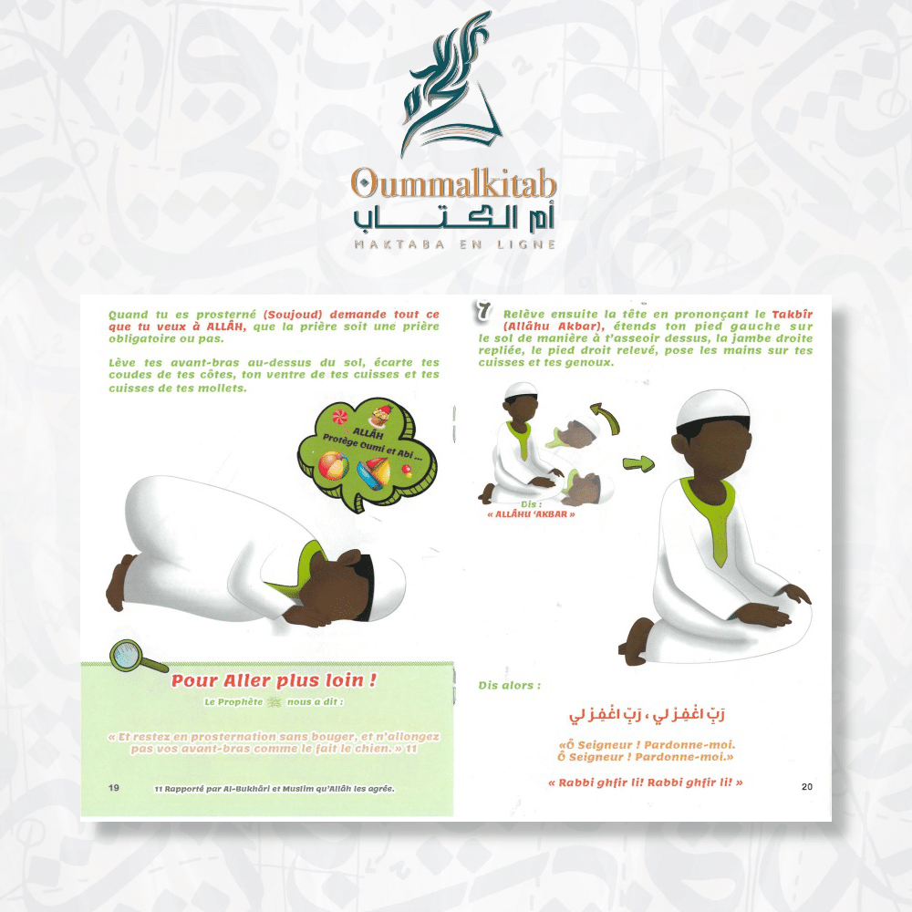 Cet ouvrage ne se contente pas d’expliquer les gestes ; il détaille avec précision chaque étape, de l’intention à la salutation finale. Votre enfant découvrira comment accomplir la prière de fajr (l’aube) pour bien commencer sa journée, ainsi que le rythme des autres obligations : la priere de dohr, la prière asr, la prière de maghreb et enfin la prière icha.