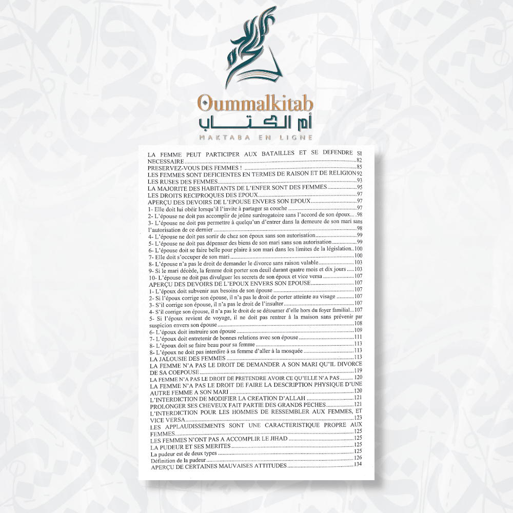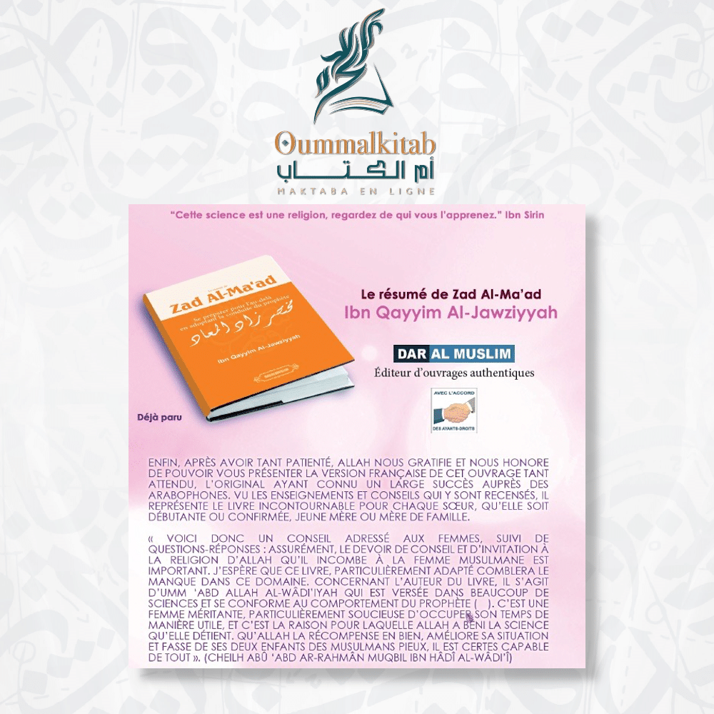 Ce livre comprend des conseils précieux destinés à la femme musulmane, accompagnés de questions-réponses. Il souligne le devoir de conseil et d’invitation à la religion d’Allah qui incombe à chaque femme envers ses sœurs. Il comble un vide important en proposant des orientations et des réponses aux questions que peuvent se poser les femmes musulmanes dans leur vie quotidienne.