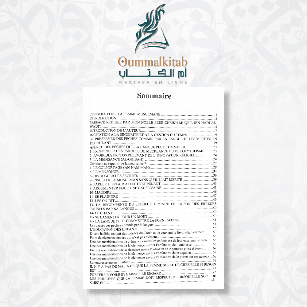 Ce livre débute par une préface rédigée par le vénérable Cheikh Muqbil, un grand savant du Yémen, qui souligne l’importance des conseils que les femmes doivent se donner les unes aux autres. L’auteur, Umm ‘AbdAllah Al-Waâdi’iya, est une femme érudite dont la science est un trésor pour la communauté musulmane. Elle s’inspire du comportement du Prophète Muhammad (que la paix et les bénédictions de Dieu soient sur lui) et se consacre à transmettre ses connaissances à ses sœurs en religion.