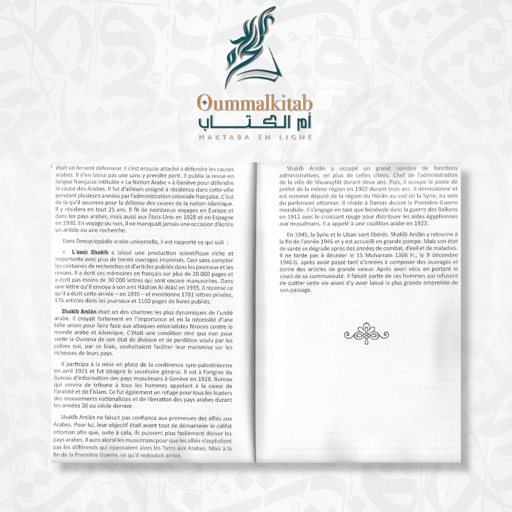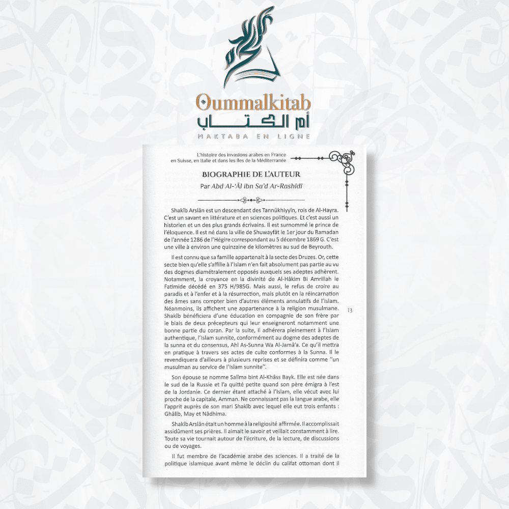 Cette exploration approfondie est guidée par l’érudition de Shakîb Arslân, un historien et homme de lettres libanais renommé. Ses analyses éclairantes et commentaires perspicaces offrent une perspective unique sur ces événements cruciaux, élargissant notre compréhension de cette période charnière de l’histoire.