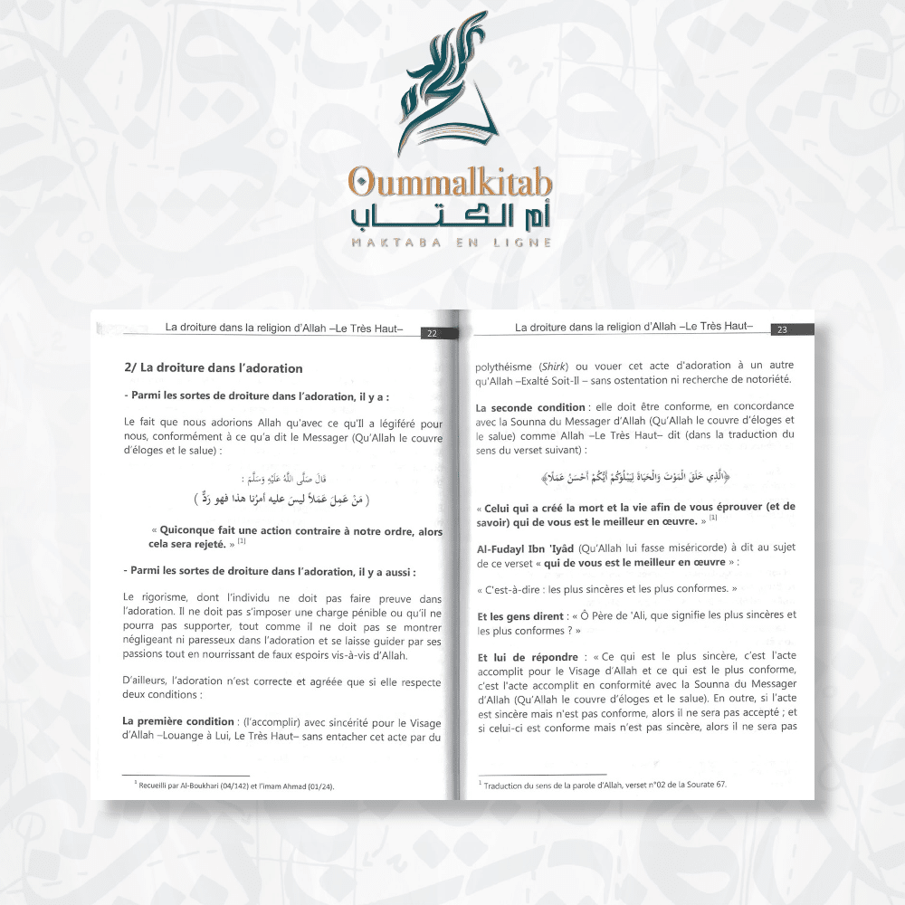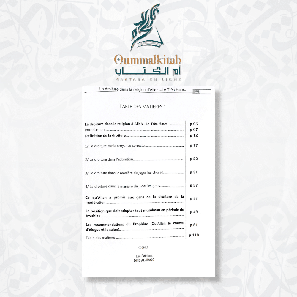 « La Droiture dans la Religion d’Allah » est bien plus qu’un simple livre.Il offre une compréhension profonde et des conseils pratiques sur la manière de vivre selon les préceptes de la droiture dans la religion d’Allah. En suivant les enseignements de ce livre, les lecteurs peuvent cultiver une relation plus profonde avec leur Créateur, trouver la paix intérieure et le bonheur véritable, et préparer leur âme pour le bonheur éternel dans l’Au-delà.