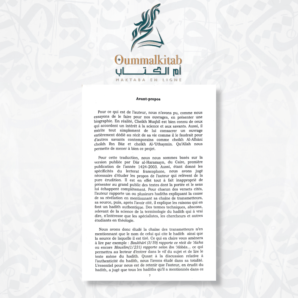 Le Coran et la Sunna du Messager d’Allah sont les fondements de la religion, et cet ouvrage les relie de manière magistrale. Pour chaque verset cité, l’auteur rapporte un ou plusieurs hadiths qui expliquent les circonstances de leur révélation. Ces hadiths sont présentés avec leurs chaînes de transmetteurs et leurs sources, puis l’auteur explique les raisons pour lesquelles un hadith est authentique.