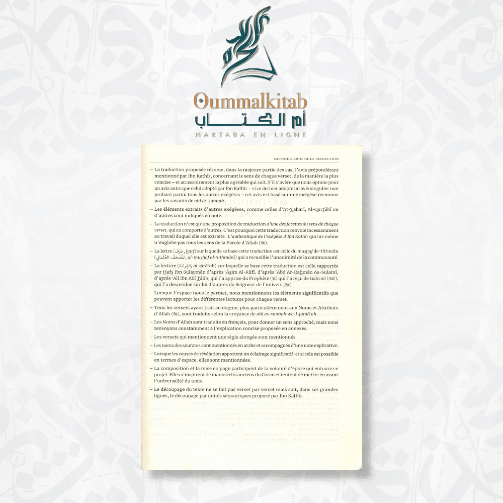 Le livre est le fruit d’une traduction réalisée par Nabil Aliouane et révisée par Rachid Ouzzi. Cette édition, publiée par Éditions Tawbah, s’inscrit dans la lignée d’une méthodologie précieuse développée par Shaykh Muhammad Taqi Ad-Dîn Al-Hilâlî et le Dr. Muhammad Muhsin Khân. Conçue comme une « Traduction explicative, » elle vise à clarifier et à éclairer le sens des versets coraniques. Cette approche respecte l’authenticité et la profondeur du texte, tout en le rendant accessible à un public francophone.