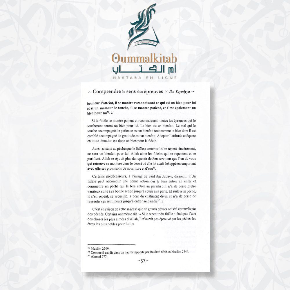 À travers ces magnifiques enseignements, vous aspirerez à adopter l’attitude de nos pieux prédécesseurs, qui trouvent de la positivité quelles que soient les circonstances. En effet, le pessimisme et le fatalisme n’ont pas leur place dans le cœur vibrant d’évocation d’Allah. Ce livre vous fournira les clés pour comprendre vos épreuves, mais surtout pour vous réformer grâce à elles. Car ceux qui ne profitent pas de ces difficultés finissent souvent par s’éloigner d’Allah. Nous vous recommandons également de lire « Comment augmenter sa foi et éviter qu’elle ne diminue » pour approfondir davantage votre foi.