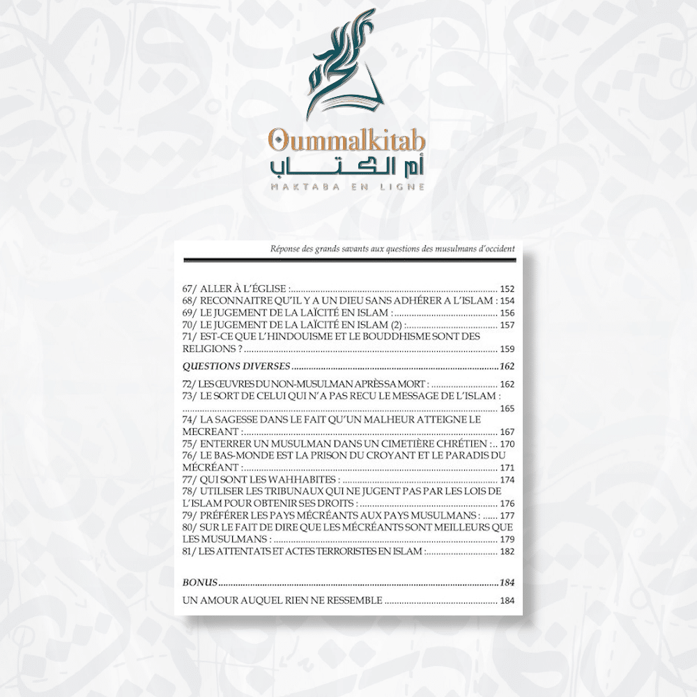 Le livre « Réponses des Grands Savants aux Questions des Musulmans d’Occident – Volume 1″ est une précieuse source de réponses aux interrogations qui jalonnent la vie quotidienne des musulmans vivant en Occident. Les défis et les questions auxquelles ils sont confrontés sont nombreux et variés, allant de la pratique religieuse à la vie familiale et aux interactions avec la société non-musulmane. Dans ce volume, des érudits renommés tels que Cheikh Ibn Baz, Cheikh Ibn Outhaymine et Cheikh Fawzan partagent leurs avis religieux éclairés sur une multitude de sujets, offrant des orientations pratiques et spirituelles aux musulmans résidant en Occident.